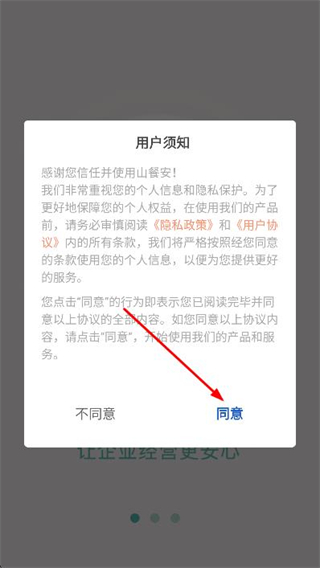 1、打開(kāi)山餐安app,在彈出的用戶(hù)須窗口中,點(diǎn)擊同意按鈕。