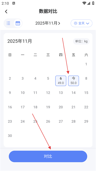 2、在數(shù)據(jù)對比頁面,選擇要對比的兩天日期,點擊對比按鈕。