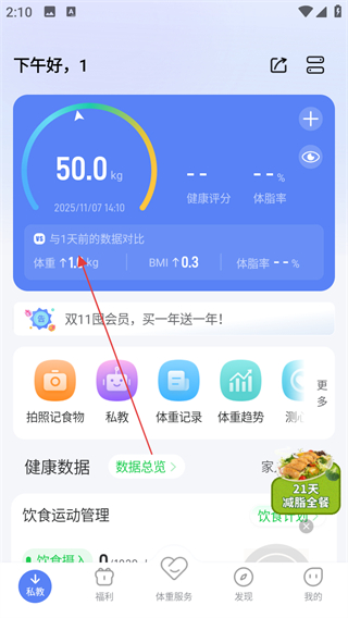 1、打開輕牛健康A(chǔ)PP,點擊體重數(shù)據(jù)區(qū)域的與1天前的數(shù)據(jù)對比。