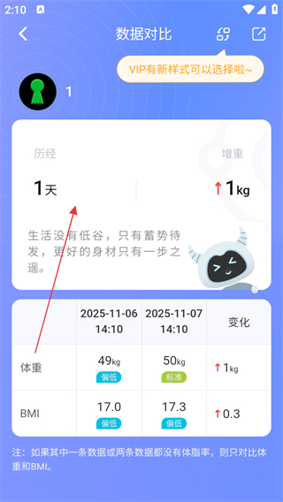 3、查看這兩天的體重、BMI等數(shù)據(jù)對比情況。
