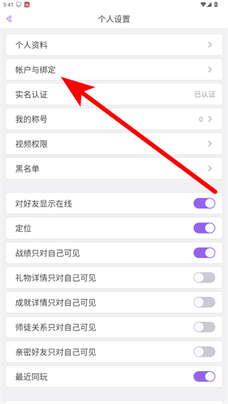 3、在個人設置界面中,找到并點擊帳戶與綁定選項。