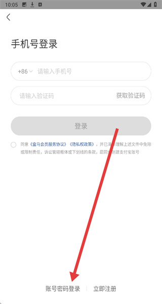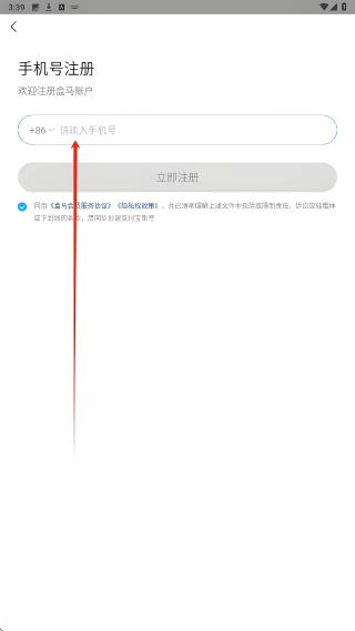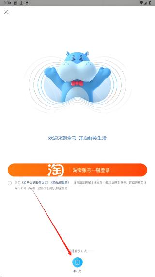 1、在盒馬登錄界面,點(diǎn)擊底部手機(jī)號(hào)圖標(biāo),進(jìn)入手機(jī)號(hào)登錄頁(yè)面,開(kāi)啟賬號(hào)登錄或注冊(cè)的操作流程。