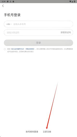 2、在手機(jī)號(hào)登錄頁(yè)面,點(diǎn)擊下方立即注冊(cè)按鈕,切換至手機(jī)號(hào)注冊(cè)界面,準(zhǔn)備進(jìn)行新賬號(hào)注冊(cè)。