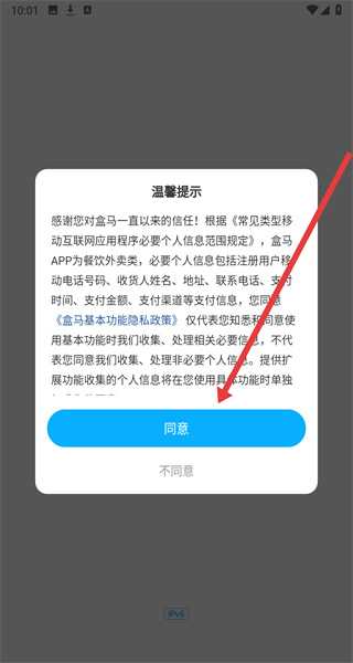 1、點(diǎn)擊盒馬APP彈窗中的同意按鈕,確認(rèn)隱私政策后進(jìn)入主界面。