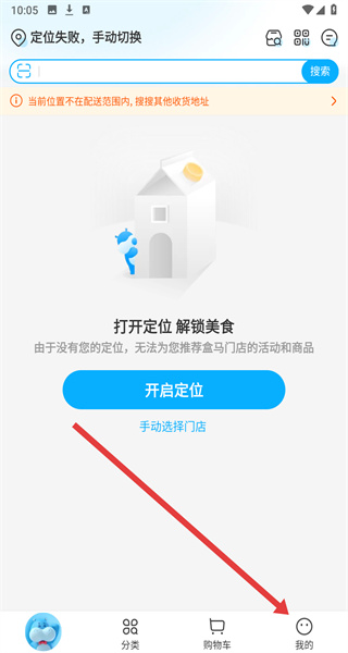 2、在盒馬主界面,點(diǎn)擊底部導(dǎo)航欄最右側(cè)的我的,進(jìn)入個(gè)人中心頁(yè)面。