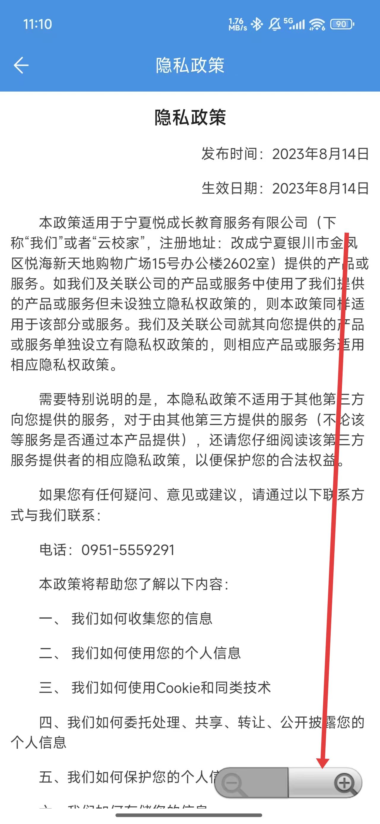 3、在跳轉(zhuǎn)到隱私政策頁面后,可以點(diǎn)擊下方放大按鈕,方便搞好的查看。