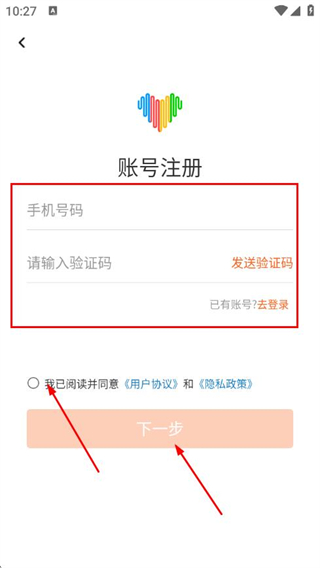 2、在賬號注冊頁面輸入手機(jī)號碼,輸>入驗證碼,勾選協(xié)議,點擊下一步。