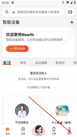 1、打開Wearfitpro應(yīng)用,進(jìn)入首頁,點擊底部導(dǎo)航欄中的設(shè)備選項。