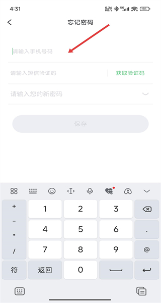 4、在忘記密碼界面,輸入手機(jī)號碼后點(diǎn)擊獲取驗(yàn)證碼,填寫驗(yàn)證碼后設(shè)置新密碼,點(diǎn)擊保存按鈕,完成密碼重置操作。