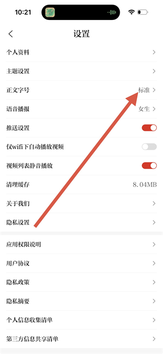 3、在設(shè)置界面,點擊正文字號選項,彈出字號選擇框。
