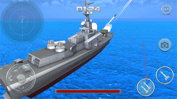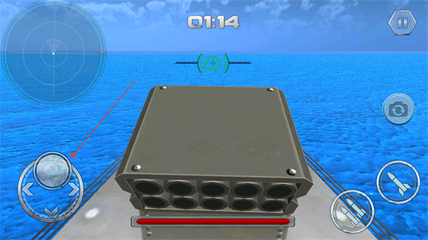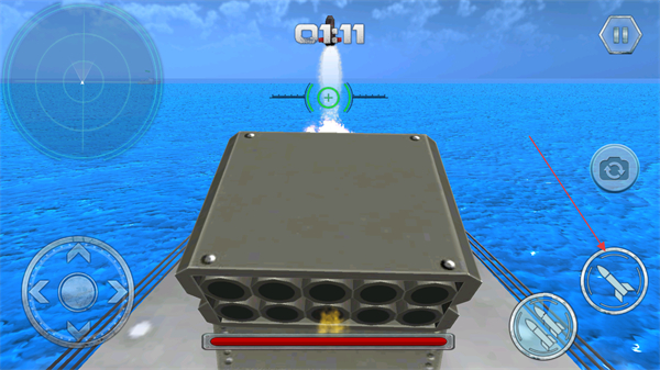 3、點擊右側(cè)火箭圖標按鈕發(fā)射炮彈,可借助左側(cè)雷達輔助瞄準敵方戰(zhàn)艦。
