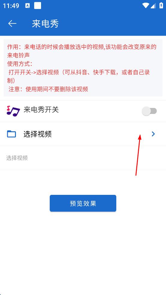 3、在來電秀頁面點擊選擇視頻,然后選擇要設(shè)置的視頻。