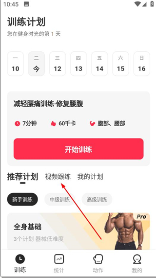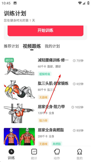 2、在視頻跟練頁面,選擇要跟練的訓(xùn)練項(xiàng)目。