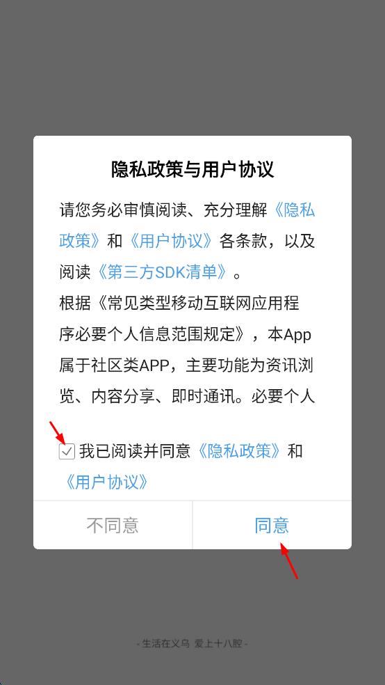 1、勾選“我已閱讀并同意隱私政策和用戶協(xié)議,然后點(diǎn)擊“同意”按鈕,進(jìn)入APP首頁。