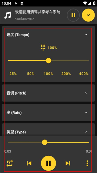 4、進入音頻播放頁面,可調(diào)節(jié)速度、音調(diào)、率、類型等參數(shù),進行播放控制。