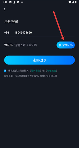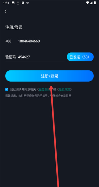 4、輸入收到的驗證碼“454627”,點擊“注冊/登錄”按鈕,完成賬號登錄。