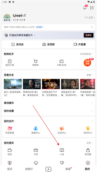 2、進(jìn)入個人中心的頁面內(nèi),在我的服務(wù)下點(diǎn)擊小說。