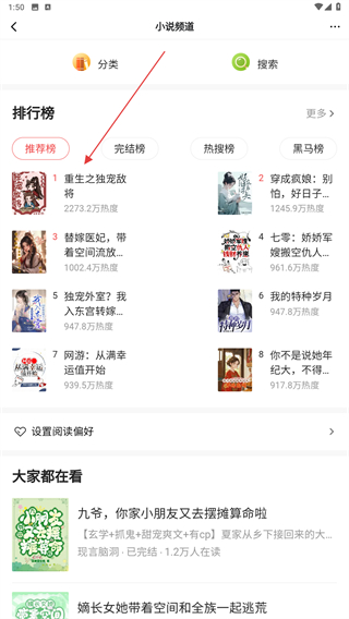 3、進(jìn)入小說頻道的頁面內(nèi),選擇并點(diǎn)擊要觀看的小說名稱即可。