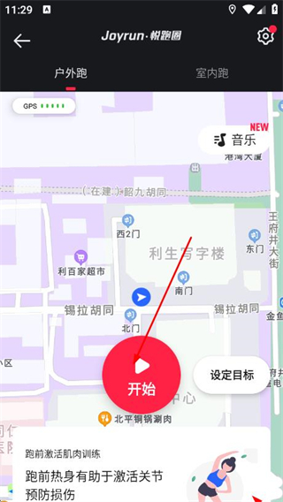 2、在跑步設(shè)置頁(yè)面點(diǎn)擊紅色開(kāi)始,啟動(dòng)跑步記錄功能。