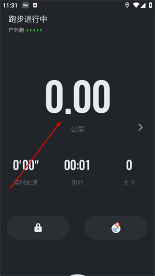 3、啟動(dòng)后即可開(kāi)始跑步,APP會(huì)實(shí)時(shí)記錄跑步的公里數(shù)、配速、用時(shí)等數(shù)據(jù)。