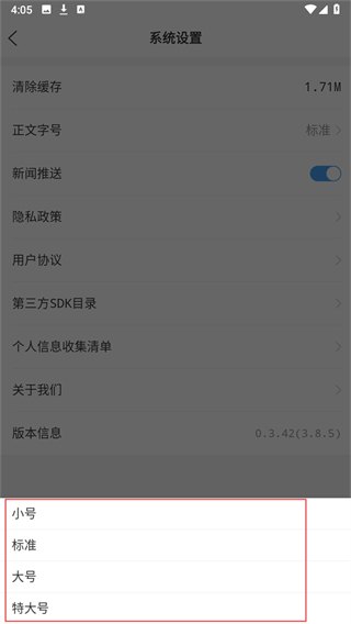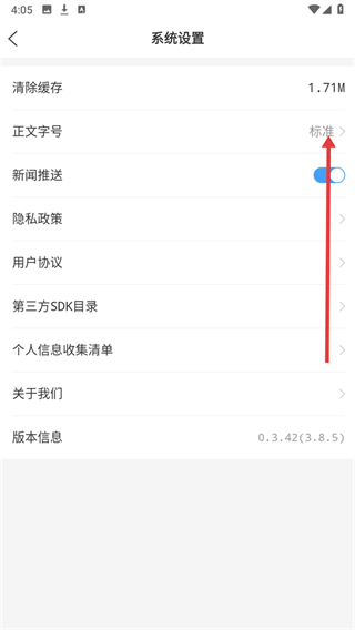 3、找到正文字號選項,點擊箭頭進入字號選擇頁面。