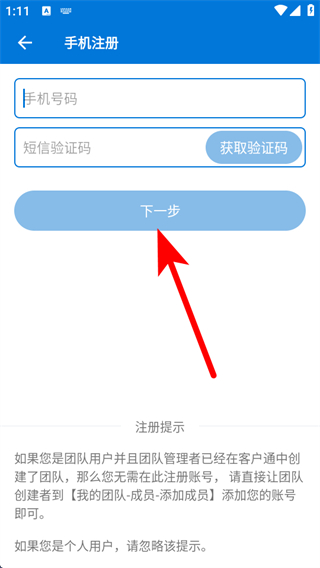 2、在手機(jī)注冊(cè)頁(yè)面,輸入手機(jī)號(hào)碼和短信驗(yàn)證碼,點(diǎn)擊下一步。