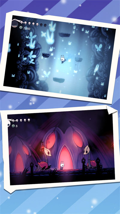 1、左右和跳起控制小小騎士,跳過(guò)懸崖,臺(tái)階等障礙,躲避藏在懸崖下的敵人;