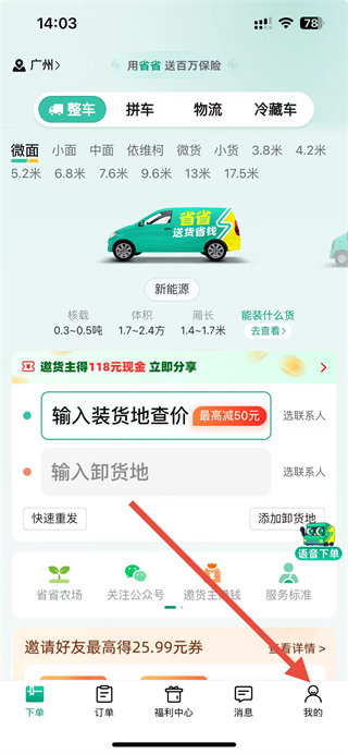 1、在省省回頭車首頁(yè),點(diǎn)擊右下角我的進(jìn)入個(gè)人頁(yè)面。