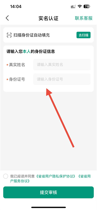 4、在實(shí)名認(rèn)證頁(yè)面,輸入真實(shí)姓名和身份證號(hào),勾選同意協(xié)議后點(diǎn)擊提交審核完成認(rèn)證。