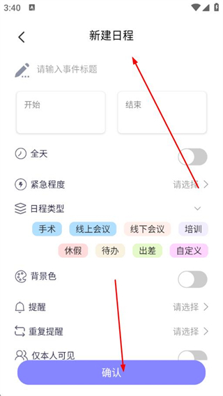 3、在新建日程頁面填寫信息,點(diǎn)擊確認(rèn),即可添加日程信息。