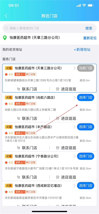 2、進入附近門店頁面后,選擇想要切換的門店,點擊選擇門店。