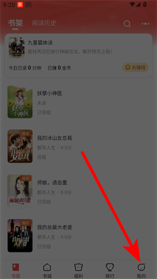 1、打開(kāi)閱友小說(shuō)應(yīng)用,進(jìn)入書架界面點(diǎn)擊底部導(dǎo)航欄最右側(cè)我的圖標(biāo)。