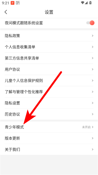 3、在設(shè)置頁(yè)面,點(diǎn)擊青少年模式選項(xiàng),進(jìn)入對(duì)應(yīng)設(shè)置界面。