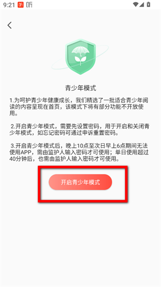 4、在青少年模式界面,點(diǎn)擊開(kāi)啟青少年模式按鈕,即可開(kāi)啟該模式。