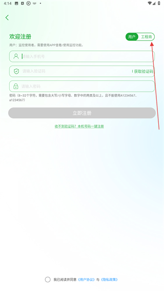 2、進(jìn)入注冊的頁面內(nèi),點擊工程商進(jìn)行切換。