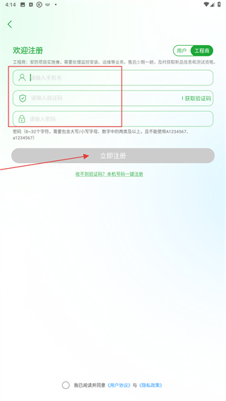 3、輸入手機(jī)號、驗證碼以及密碼,再點擊立即注冊。
