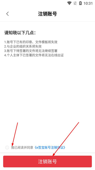 4、在注銷賬號說明頁面勾選后,點擊注銷賬號,即可完成賬號注銷操作。