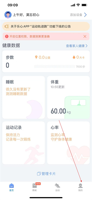 1、打開樂心健康A(chǔ)PP,點擊底部導(dǎo)航欄我的。