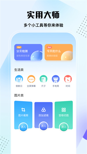 實(shí)用大師是手機(jī)上的工具箱應(yīng)用,匯聚了眾多類型的工具給大家挑選,包含了多樣類型、用途的工具,可以大大提高大家的做事效率,都是簡(jiǎn)單操作就能快速上手使用,感受到超便捷舒適的服務(wù),讓大家的生活更加享受、更加的便捷。