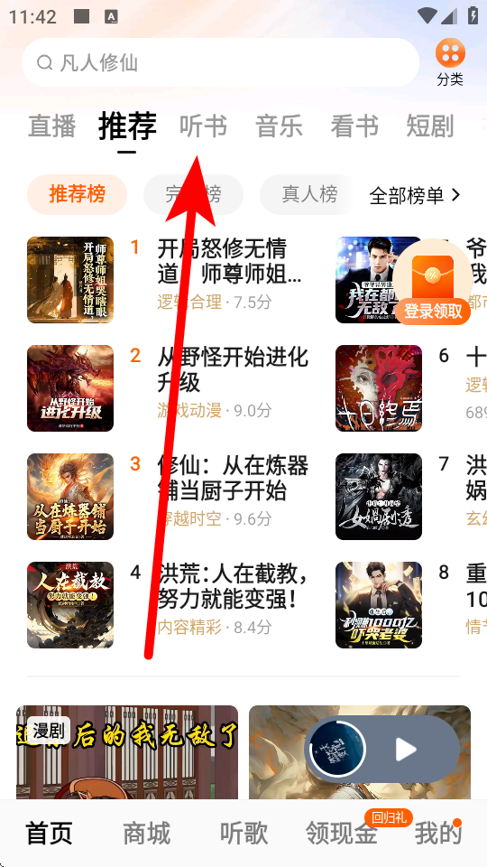 1、在番暢聽(tīng)首頁(yè),點(diǎn)擊聽(tīng)書(shū)選項(xiàng),進(jìn)入聽(tīng)書(shū)頁(yè)面。