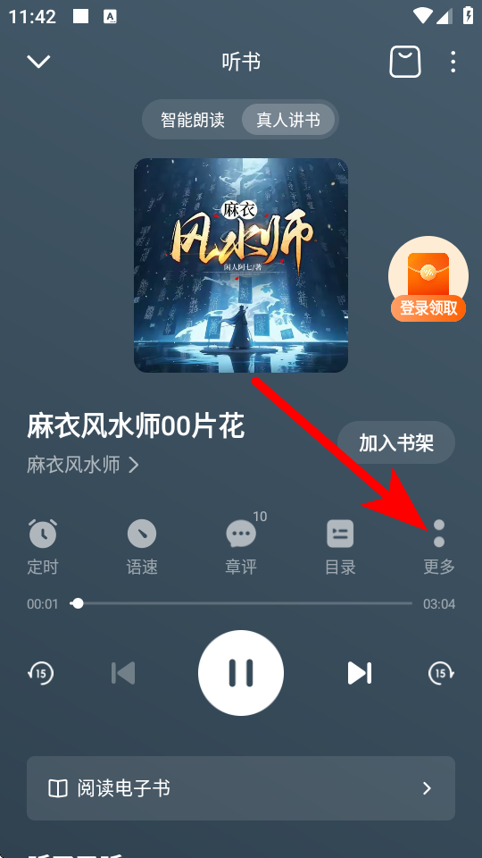 4、在聽(tīng)書(shū)播放界面,點(diǎn)擊更多選項(xiàng),彈出功能菜單后。