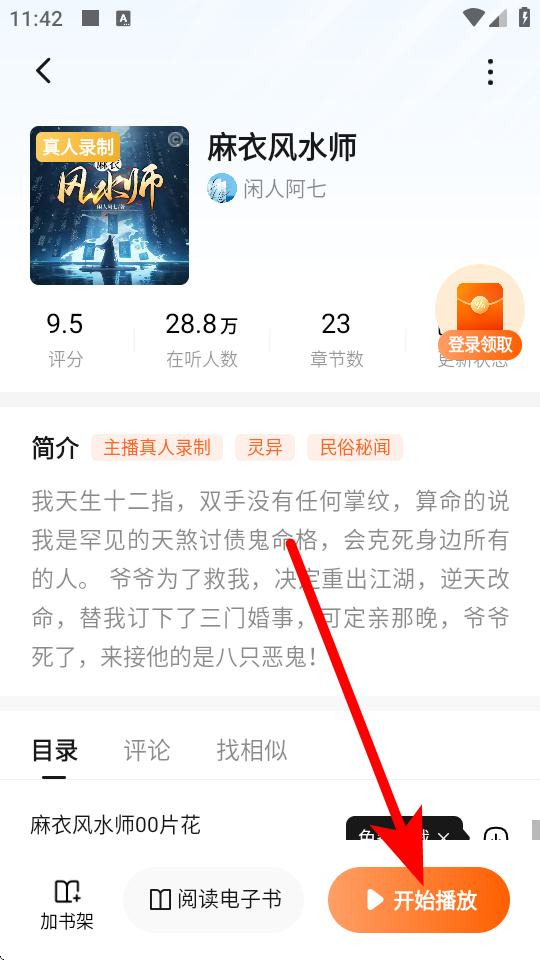 3、在小說(shuō)詳情界面,點(diǎn)擊開(kāi)始播放按鈕,進(jìn)入聽(tīng)書(shū)播放界面。
