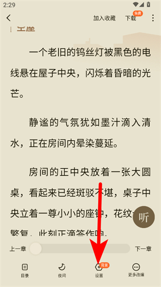 3、在小說閱讀頁面,點擊設置選項,展開設置菜單。