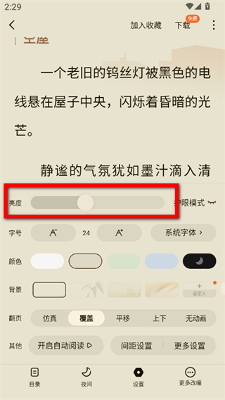 4、在設置菜單中,拖動亮度調(diào)節(jié)條向右,即可提高閱讀界面的亮度。