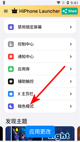 1、在HiPhone Launcher頁(yè)面,點(diǎn)擊暗色模式選項(xiàng),進(jìn)入暗色模式設(shè)置頁(yè)面。