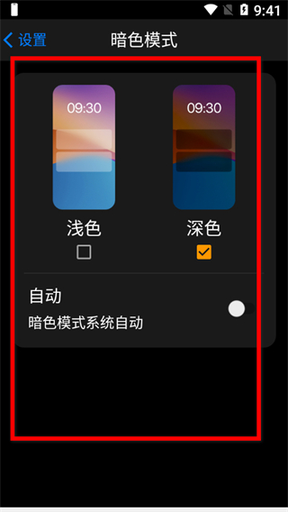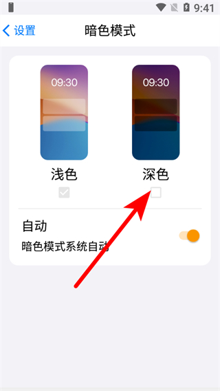 2、在暗色模式設(shè)置頁(yè)面,點(diǎn)擊深色選項(xiàng),完成模式選擇。