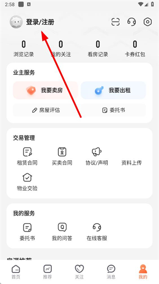 2、在我的頁面中,找到并點擊上方的登錄/注冊選項。