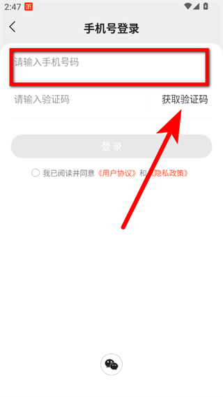 3、在手機(jī)號登錄頁面,輸入手機(jī)號碼并點(diǎn)擊獲取驗證碼。