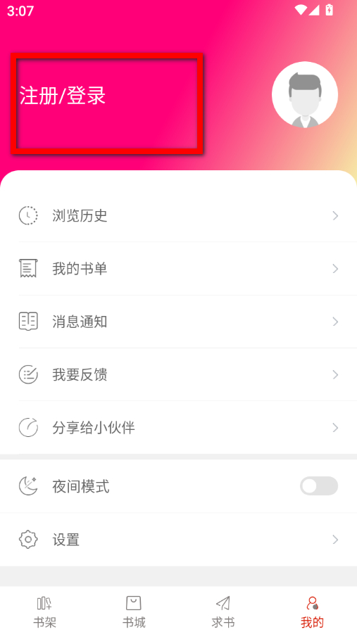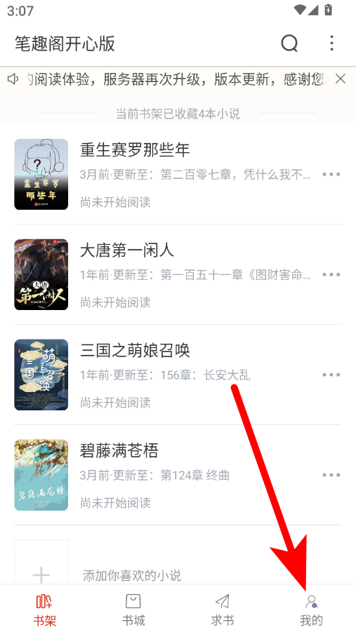 1、在筆趣閣開心版書架頁(yè)面,點(diǎn)擊右下角我的選項(xiàng),進(jìn)入個(gè)人中心界面。