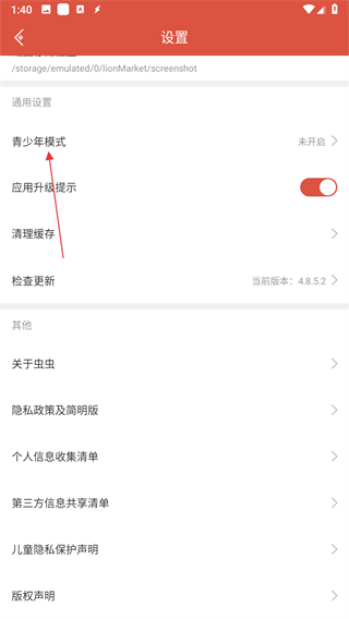 3、在設(shè)置頁(yè)面找到青少年模式選項(xiàng),點(diǎn)擊進(jìn)入青少年模式設(shè)置頁(yè)面。